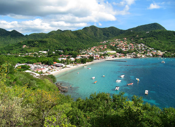 | Z vrchu jsem v dálce viděla ostrov Svaté Lucie s oběma Pitony (ty špičaté kopce vpravo). |