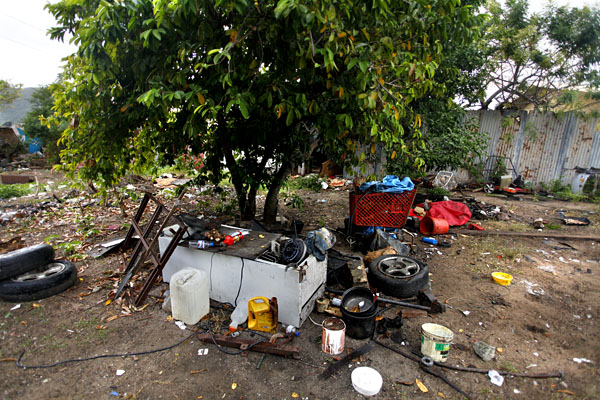 | Je čas se vrátit. Hned za ploty luxusních hotelů se válí různé zbytky nepoužitých materiálů. Třeba tato hromada bělostného písku na pláž. |